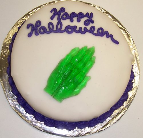 Chocolate Decorated Cake Single Layer 8" Round Topped with Gummie Witch Hand Purple Trim Reviews